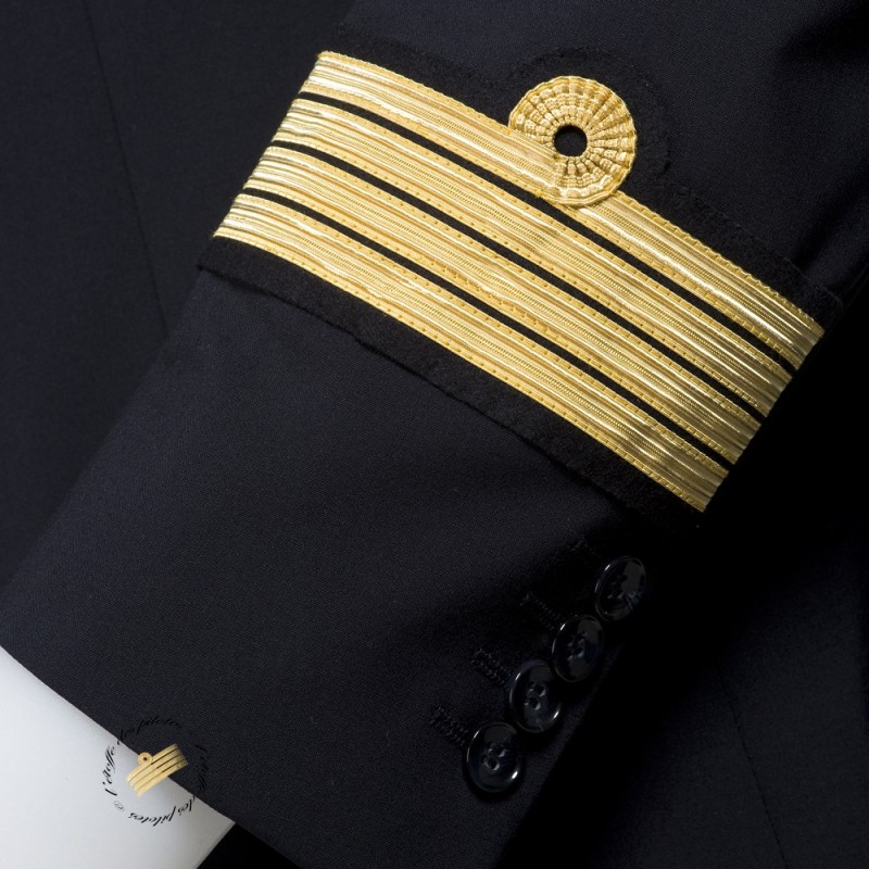 Veste d'uniforme coupe croisée, galons cousus aux manches (galonnage et pose inclus). Confection française pour Marine-Crew.